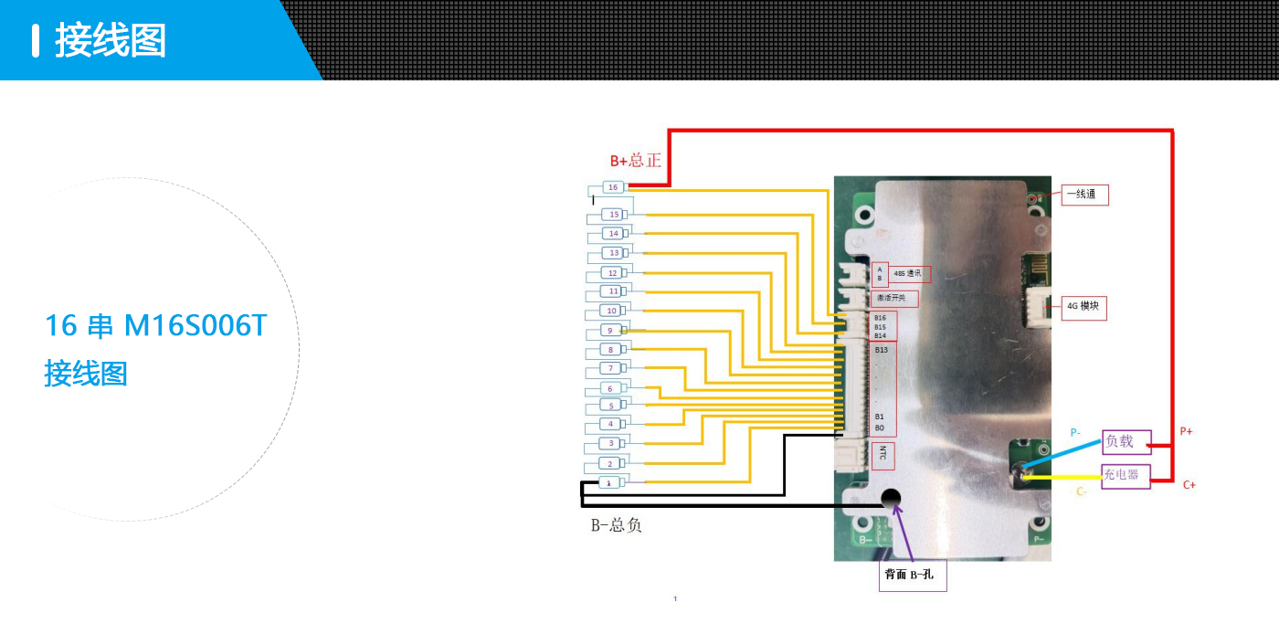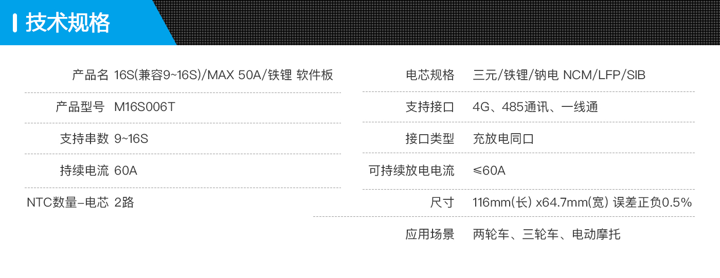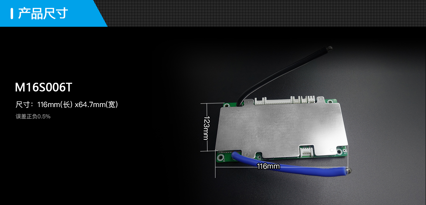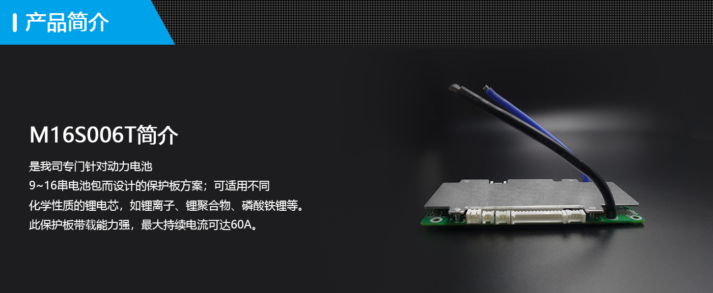 河馬M16S006T是我司專門針對動力電池 9~16串電池包而設計的保護板方案;可適用不同 化學性質的鋰電芯,如鋰離子、鋰聚合物、磷酸鐵鋰等。此保護板帶載能力強,最大持續電流可達50A。